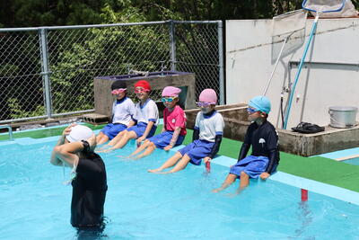 夏休みを前に、着衣泳体験をしました。仰向けになって浮かぶのと、ペットボトルを首元に持って浮かぶのとの違いを体感したり、ペットボトルに少し水を入れて投げると空のペットボトルより投げやすいことを体感したり、水の中では脱衣しにくいことを体感したりするなど、日頃の水泳の授業とは違う命を守る体験ができました。