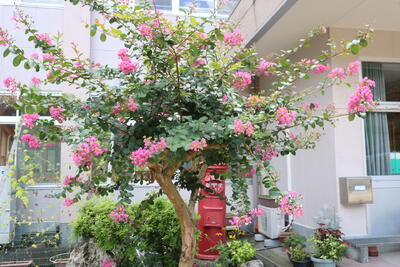 玄関横の百日紅が鮮やかな花を咲かせています。