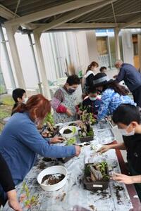 宮崎県技能士会の方に来ていただき、造園(箱庭づくり)をおじいちゃんおばあちゃんたちと一緒に体験しました。(*^^)v