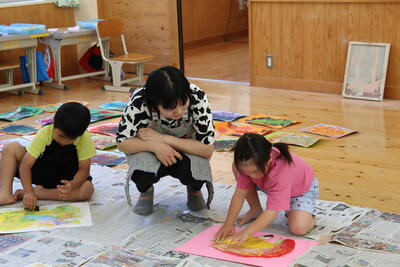 椎葉村の森のアーティストの皆さんに「とろとろ絵の具で」という題材の図工の授業に参加していただきました。子どもたちも、とても楽しく制作活動に取り組み、素敵な作品がたくさん完成しました。