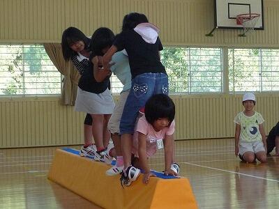 業間に行っている体力づくり。今日は5・6年生が集合学習でいないので、1~4年生だけで行いました。細い台の上で一人を端の方まで渡すゲームです。