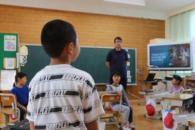 1・2年生は、今年度はじめて、ALTのアーロン先生による英語の活動を行いました。アーロン先生がオーストラリアの画像を見せるたびに、子どもたちから「お~~」という大きな歓声がわいたり、英語での色の質問に大きな声で答えるなど、反応がとてもよく、アーロン先生も子どもたちの楽しんでいることがよくわかりました。