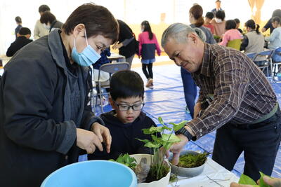 県技能士会連合会の方々に室内園芸装飾を教えていただく「ものづくり体験教室」を行いました。当日は、子どもたちと一緒に子どもたちの祖父母の皆様にも参加していただき、和やかな雰囲気のなかで、交流ができました。祖父母の皆様から「とっても楽しかったです!」と、うれしいお言葉をたくさんいただきました。