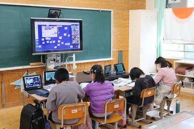 村内ほとんどの学校は完全複式です。6年生と56年担任は修学旅行に行っているので、5年生の学習を進めるために、椎葉小の5年担任の先生がZOOMを使って、村内5校の5年生を一斉に指導する時間を修学旅行の間に数時間作っています。2校で行うZOOMでの授業は日常的に行っているので、担任不在でも子どもたちは慣れたもので、自分たちでどんどん進めていきます。