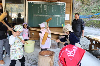 持久走大会の後、保護者の方が用意してくださった蒸かし芋とぜんざいで体をあたため、餅つきを始めました。杵でペッタンペッタン。お餅を上手に丸めて、みんなでおいしくいただきました。