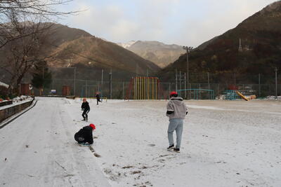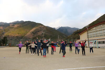 2023年最後の朝ダンスです。遠くの山頂には、うっすら雪が積もっています。子どもたちがダンスをしている間も、雪がちらほら舞っていました。