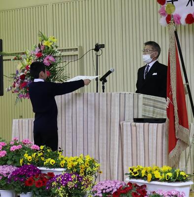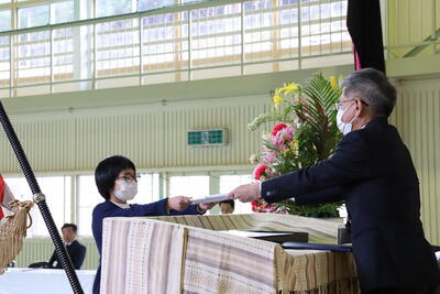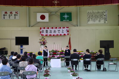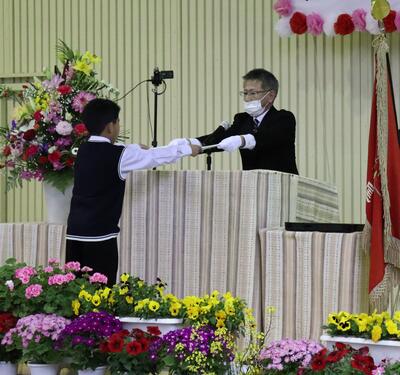 令和5年度の修了式。代表児童が壇上で修了証をもらいました。