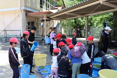 学校の梅の木から梅を収穫しました。その量、約60キロ!例年と比べると、少し量は少ないのですが、とても立派な梅がとれました。梅干し、梅ジュース、・・・。できあがりが楽しみです!