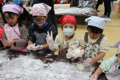 持久走大会の後、保護者の方が用意してくださった蒸かし芋とぜんざいで体をあたため、餅つきを始めました。杵でペッタンペッタン。お餅を上手に丸めて、みんなでおいしくいただきました。