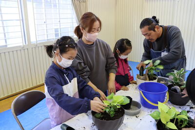 県技能士会連合会の方々に室内園芸装飾を教えていただく「ものづくり体験教室」を行いました。当日は、子どもたちと一緒に子どもたちの祖父母の皆様にも参加していただき、和やかな雰囲気のなかで、交流ができました。祖父母の皆様から「とっても楽しかったです!」と、うれしいお言葉をたくさんいただきました。