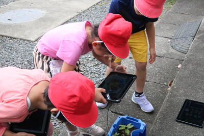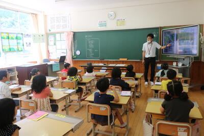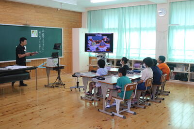 椎葉村には小学校は5校あります。松尾から一番遠くの小学校に行くには1時間以上かかります。また、各校、児童数が少ないという実態もあります。そこで、「ユニット学習」と言って、村内の他校とタブレットで接続し、一人の教師が複数の学校間で同時に授業をするという研究を行っています。時に回線がうまくつながらないなど、アクシデントもありますが、子ども達も楽しみにしている大変意義のある学習です。