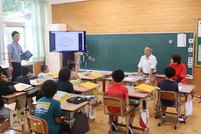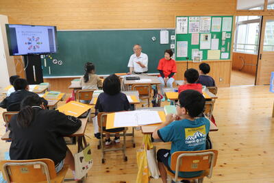椎葉村の小中学校では、総合的な学習の時間のなかに「椎葉村学」を位置づけ、椎葉村について学ぶ探究学習を行っています。この画像は、3・4年生が地域の方を、方言の講師としてお招きし、椎葉村の方言を学んでいるところです。子ども達も「じいちゃんが言ってた!」「知ってる!」「聞いたことがある!」など反応しながら、講師の方の説明を一生懸命聞いていました。おじいちゃん、おばあちゃん、ひいおじいちゃん、ひいおばあちゃんが身近にいて、いつも聞いている椎葉のことば。子どもたちも椎葉村で育っていることに誇りを感じているようでした。