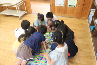 椎葉小学校に村内小学生が集まって、一緒に一日を過ごす集合学習が今、行われています。1年生は、保育所の交流で会ったことがあるくらいですし、椎葉小での学習は初めてなのでドキドキしていたみたいです。でも、交流遊びなどを通じて、すぐにいろいろな子と仲良しに。