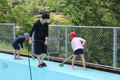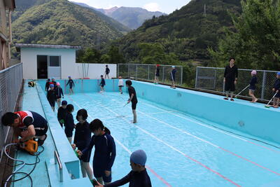プール開きが近づいてきました。水泳の授業にむけ、全校児童でプール掃除を行いました。久しぶりに水のないプールに入り、壁をゴシゴシ。とてもきれいになりました。
