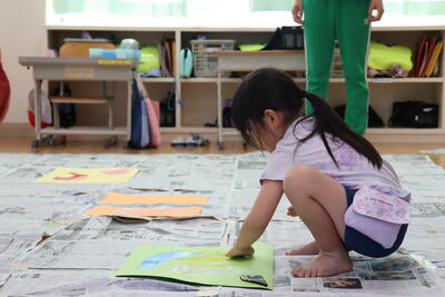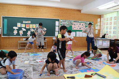 椎葉村の森のアーティストの皆さんに「とろとろ絵の具で」という題材の図工の授業に参加していただきました。子どもたちも、とても楽しく制作活動に取り組み、素敵な作品がたくさん完成しました。