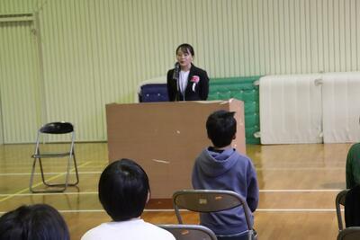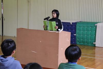 まず、6年の代表児童2名が、学習面や生活面について、頑張ることを発表しました。学習面では、算数科の「比とその利用」や社会科の歴史(特に弥生時代)でした。生活面では整理整頓や自分から進んで行動すること、譲り合う心をもつこと、たくさんのことにチャレンジすることでした。2名とも、とても具体的で分かりやすく、堂々とした発表態度でした。