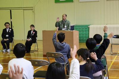 早速、6年の代表児童が、全校児童と先生たちが一緒の教室で食べる給食、地域の方々と力を合わせて地区全体で盛り上がる学校行事、全校児童みんなで仲良く元気に遊ぶ昼休みや放課後子どもクラブ等のことを歓迎のことばで教えてくれました。