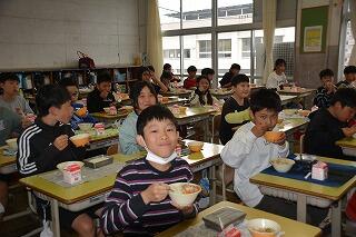 早速今日から給食が始まります。2年生は、5年生に手伝ってもらいながら準備をしていました。その他の学年においても手際よく準備していました。おいしそうに食べていました!
