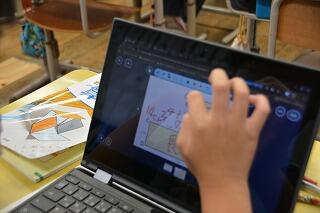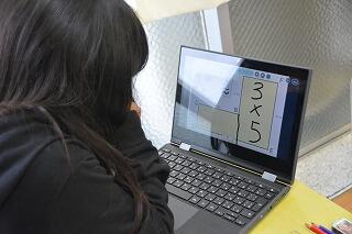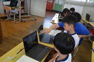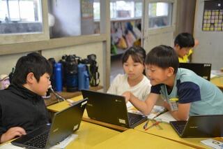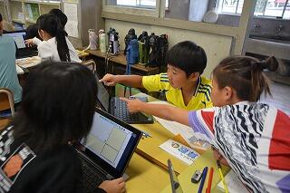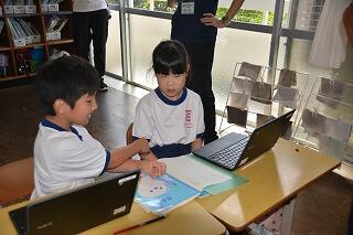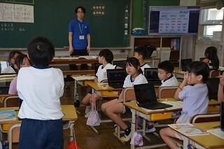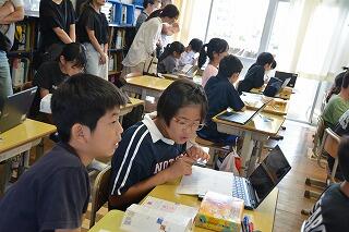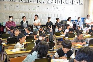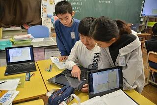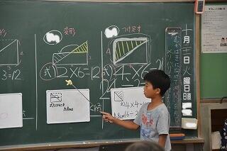 本校では「学力向上を全ての子ども達に!」と言う研究主題で、授業の在り方を研究しています。全児童に渡されている一人一台端末(タブレットPC)を活用し、子どもたち同士で学び合う学習を行っています。4年生の面積を求める学習の様子です。図に線を引いたり消したりしながら、これまでの学習で得た知識を使って、工夫しながら面積を求めていきます。そして、その考えた求め方を、タブレット端末を使って友達へ説明したり、質問に答えたりしながら、面積の求め方を自分の知識として獲得していきます。友達と同じ求め方で自分の考えを確認したり、また友達の違う求め方に気づかされたりしながら、学習が進んでいました。お互いに考えを伝え合うことで学習を深めていきます。子どもたちが楽しそうに学習していました!