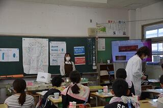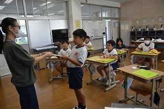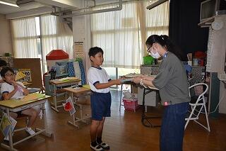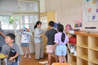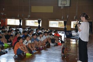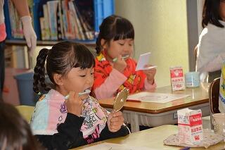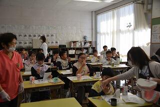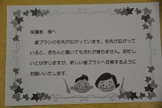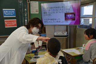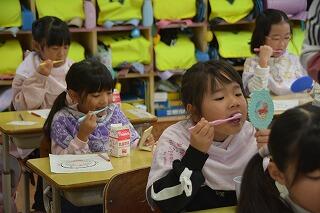 今日は、まさこの歯科クリニックから、医師と歯科衛生士をお招きし、高学年を中心に歯磨き指導をしていただきました。虫歯になる原因を学習した後に、歯の汚れを浮き出し、磨き残しをチェックしました。その後、ブラッシング指導をしていただき、きれいに磨く練習を行いました。実際に自分の磨き残しがどこにあるのかを理解できたので、これからの歯磨きに生かせるのではと思います。また、歯ブラシを1ヶ月に1回程度の交換が必要だということも学習しました。交換時となっている歯ブラシをお持ちの子どもさんへは、ドクターより交換のお知らせが配られていますので子どもさんへご確認ください。