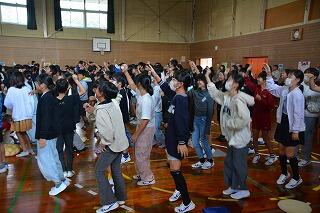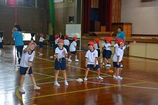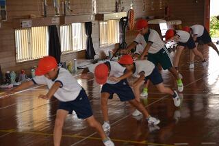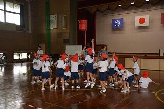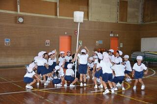 1年生が体育館で団技の練習をしていました。団技は玉入れです。2列で移動し、円になる練習からです。きれいに円になることが難しい1年生ですが、上手に円を描いていました。かわいいダンスもお楽しみですね!