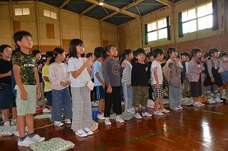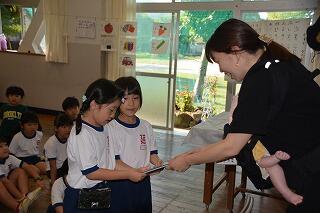 初めに校歌斉唱しました。その後の校長の話では、牧師の歌「若竹の 伸びゆくごとく 子ども達よ 真直ぐに伸ばせ 身をたましいひを」にもでてくる、竹の話をしました。竹は「丈夫で」「しなやか」な特性を持ちます。それは、「節」がしっかりとしているからです。私たちの生活にも「節目」が有ります。学校でいえば「節目=行事など」となります。節目となる行事を自分なりに目標をもってしっかりと頑張ることで、丈夫な節ができあがります。運動会をはじめ、各学年における2学期の行事をしっかりと頑張ることで、若竹のように「丈夫で」「しなやかな」成長をしてほしいと思います。保体部長からは、「目の愛護デー」にちなみ、目の健康について話がありました。その後、バレーボール、ソフトテニス、福祉作文、科学コンクールの表彰を行いました。沢山の子ども達が、様々な場所で活躍していることを嬉しく感じました。入賞おめでとう!10月も充実した月にしていきます。