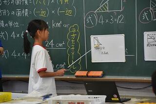 5年生:学び合う秋!今日の5年生の算数の学習の様子です。直角三角形の面積の求め方を考えていました。それぞれに求め方を考え、意見交換をしていました。また、考えたことをみんなに説明する場面も見られました。自分の考えや思いを図や式として表現し、ことばで伝える授業でした。インプットしたことを基にして考え、自分なりにアウトプットする!みんな生き生きと学習していました。