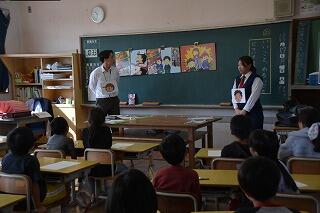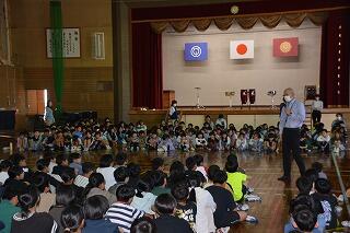 延岡警察署から警察官に来ていただき、不審者侵入時の避難訓練を行いました。事務室前から侵入し、職員が対応する訓練を行いました。子どもたちは、教室でバリケードを作り安全確保をし、放送に従って安全な場所に移動する訓練でした。まずは不審者が入りにくい環境を作ることが大切だと思います。常時鍵をするところ、出入りしたら必ず閉めるところ等、全職員、児童で日頃から意識しながら学校生活を行っていきたいと思います。