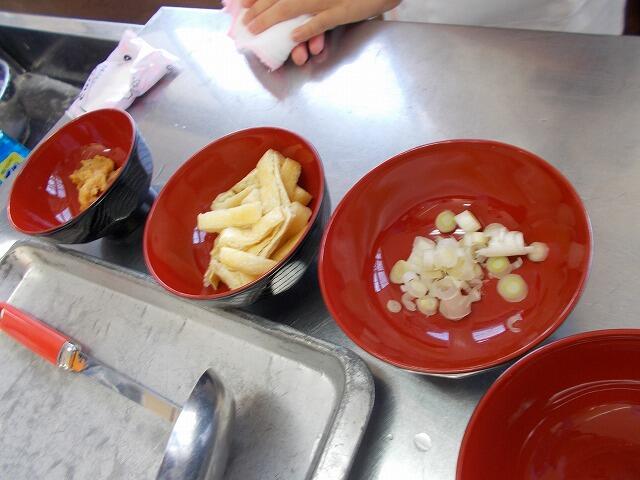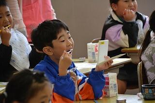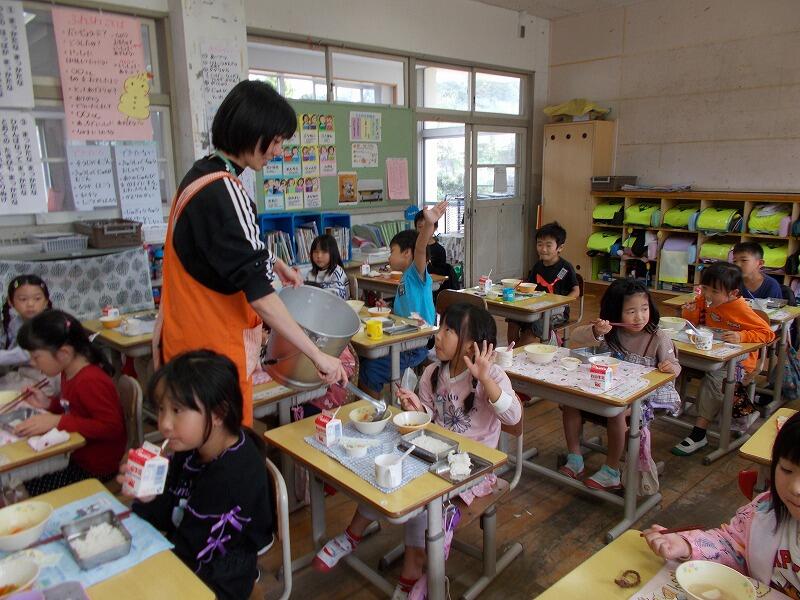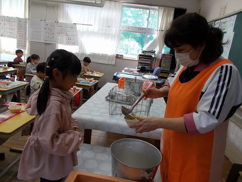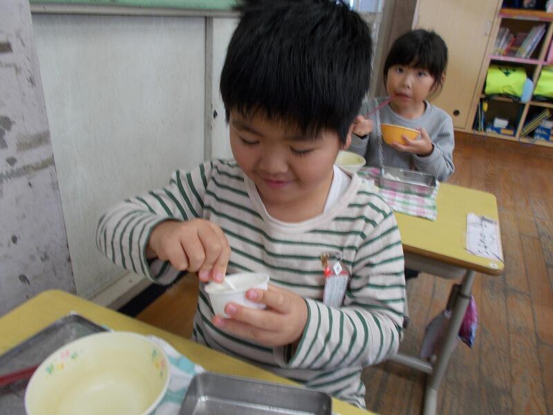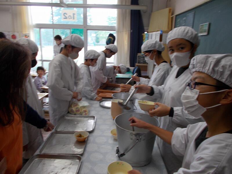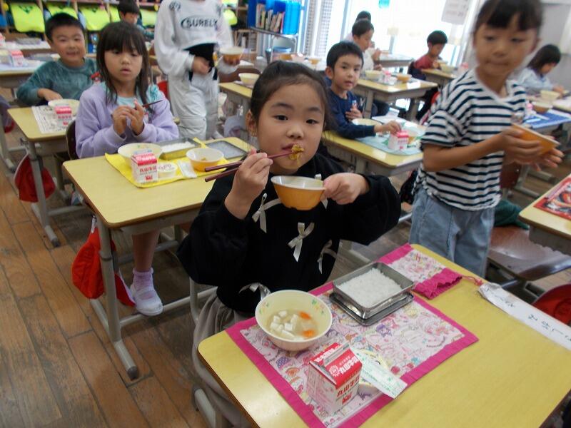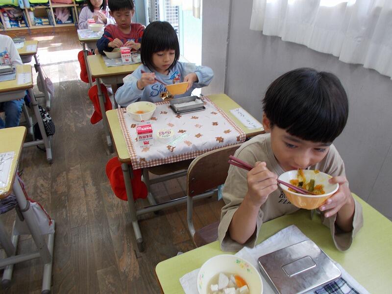 今日の給食の様子です。給食は毎日楽しみの一つです。着替え、準備から配膳そして食事や片付けを50分間で行っています。今日のメニューは「かぼちゃのそぼろに」「のっぺい汁」「ムース」でした。
