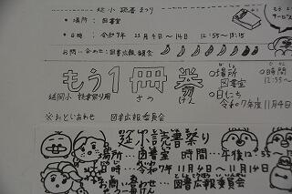 今日から14日まで2週間にわたり、「読書祭り」が開催されます。運動会と並行して、図書委員会が準備を行ってきてくれました。今日は、早速多くの子どもたちが図書館へ来館していました。この期間中に本を借りると「もう1冊券」がもらうことができ、通常2冊の貸し出しが、3冊まで借りることができるようになります。また、沢山本を借りた人へは、「しおり」のプレゼントもあります。子どもたちが立てた子どもたちの貸出冊数は、18000冊です。現在約9800冊の貸し出し状況です。秋の夜長、家族で読書!してみませんか?!
