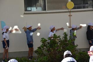 3年生が中庭で、理科「光の性質」の学習をしていました。手鏡で光を反射して壁にあて、明るさや温度等の変化を観察する学習です。体験をとおして考え実感し、みんなで意見を出し合い考えを深める学習、みんな楽しそうに学習していました。