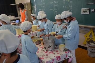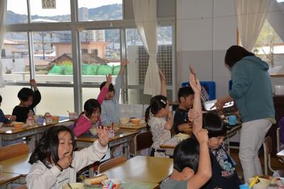 今日から1年生の給食が始まりました。みんな目を輝かせて6年生の準備の様子を見ていました。今日のメニューは、「シチュー、フルーツポンチ、パン、牛乳」です。みんなおいしそうに食べています!