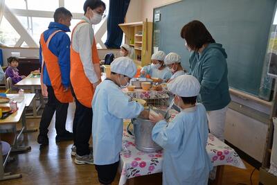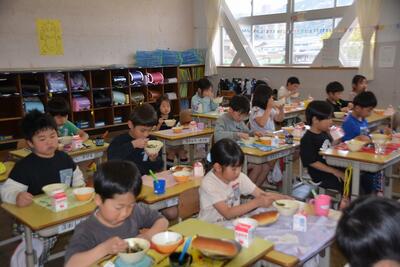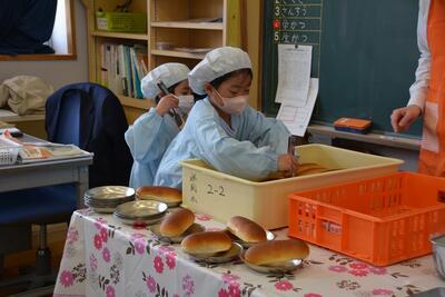 お楽しみの給食が今日から始まりました。新2年生も自分達でしっかり準備できるようになりました。たくさん食べて大きくなろう!