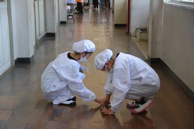6年生女児が、ほうきでは取ることのできないゴミをガムテープを使って掃除していました。「気付き 考え 幸動」した姿です!素敵ですね!