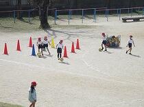 リレー遊びをしていました。この前、ご紹介した時よりも、高くなったハードルをくぐったり、跳び越したりするところが難しくなっていました。