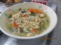 給食が運ばれてくると、食欲をそそるとてもいい香りがしてきました。それは、「チンゲンサイのたまごみそしる」の香りでした。食べてみるといろいろな野菜と卵からとてもいい「だし」が出ていてとてもおいしかったです。