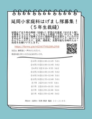 延岡小では5年の裁縫(手縫い)学習の支援者(はけまし隊)を募集しています。6~7月の10時間(下記)のうち、参加出来るときだけで結構ですので裁縫学習の支援をしていただけませんか?支援していただける方は、下記のリンクまたは下に添付のチラシのQRコードからフォームに入り、名前、連絡先、支援可能な日時の入力・送信をお願いいたします。