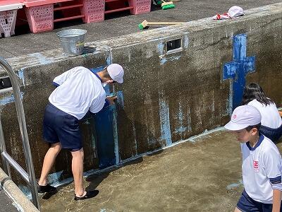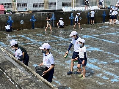 令和6年6月11日(火)、6時間目に6年生がプール清掃をがんばっていました。年によっては寒~い場合もあるのですが、今年は天気もよくプール掃除日和でした。古いプールですが、6年生のがんばりできれいになっていました。
