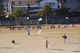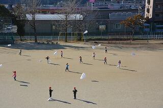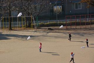 今日は1年生がたこあげをしていました。みんな楽しそうです!微風のため、走り回っています!