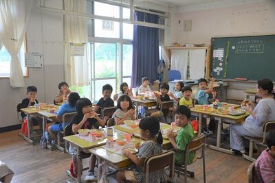 令和6年9月3日(火)、今日から2学期の給食がスタートしました。メニューはドライカレーをドッグパンに挟んで食べるおかずでした。1年生も「おいしい顔」でもぐもぐ食べていましたよ。