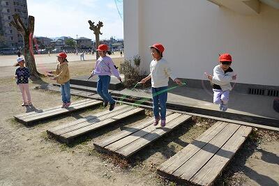 令和6年2月13日(火)の昼休み、1年生が縄跳び練習台の上で、上手にあや跳びなどをしていました。練習台の上だと、板の弾力でボヨンボヨンして跳びやすいです。