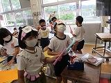 みんな、思い思いに輪っかを作って、飾りを付けたり、お面を作ったりしていました。