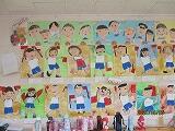2年生の廊下には、自分たちで作ったかわいいイラスト付きのかけ算の問題が、たくさん掲示されていました。問題が作れるということは「かける」ということの意味を理解していることになります。