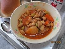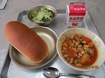 「ポークビーンズ」は大豆がたくさん入っていて、栄養満点でした。パンは黒糖パンでしたが、パンとの相性もバッチリでした。