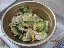「グリーンサラダ」は、その名のとおり、キャベツやブロッコリー、きゅうり、たまねぎ、にんじんなどたくさんの野菜が入ったヘルシーなサラダでした。