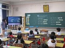 昨日、ご紹介した2年生の学級とは別の学級では、今日はかけ算九九で、子どもたちが一番覚えにくくて時間のかかる7の段の学習をしていました。