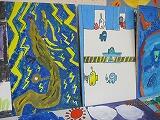 今日は下絵に絵の具で色を付けたり、釘で四角い棒を板に打ち付けたりしていました。