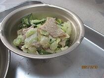 「あおまめサラダ」の青豆は、大豆の青い色のものをいうそうです。たくさん入っていて大豆のおいしさが引き立っていました。植物性のタンパク質もしっかりと補給できる一品でした。