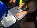 もう一つのグループは川に入って、水生生物を採取してきれいな水にいる生物か汚いところにいる生物か調べていました。