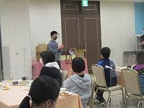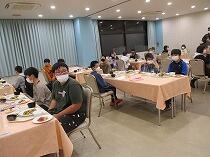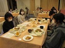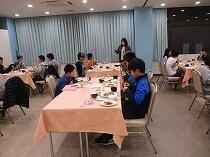 ホテルの方に挨拶をして、夕食です。いろいろな料理があり、とてもおいしかったです。種類が多すぎて食べきれない子どももいましたが、みんなおいそうにお腹いっぱいになるまで食べていました。